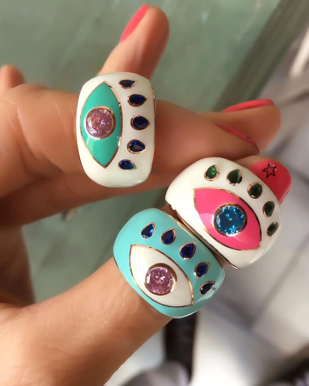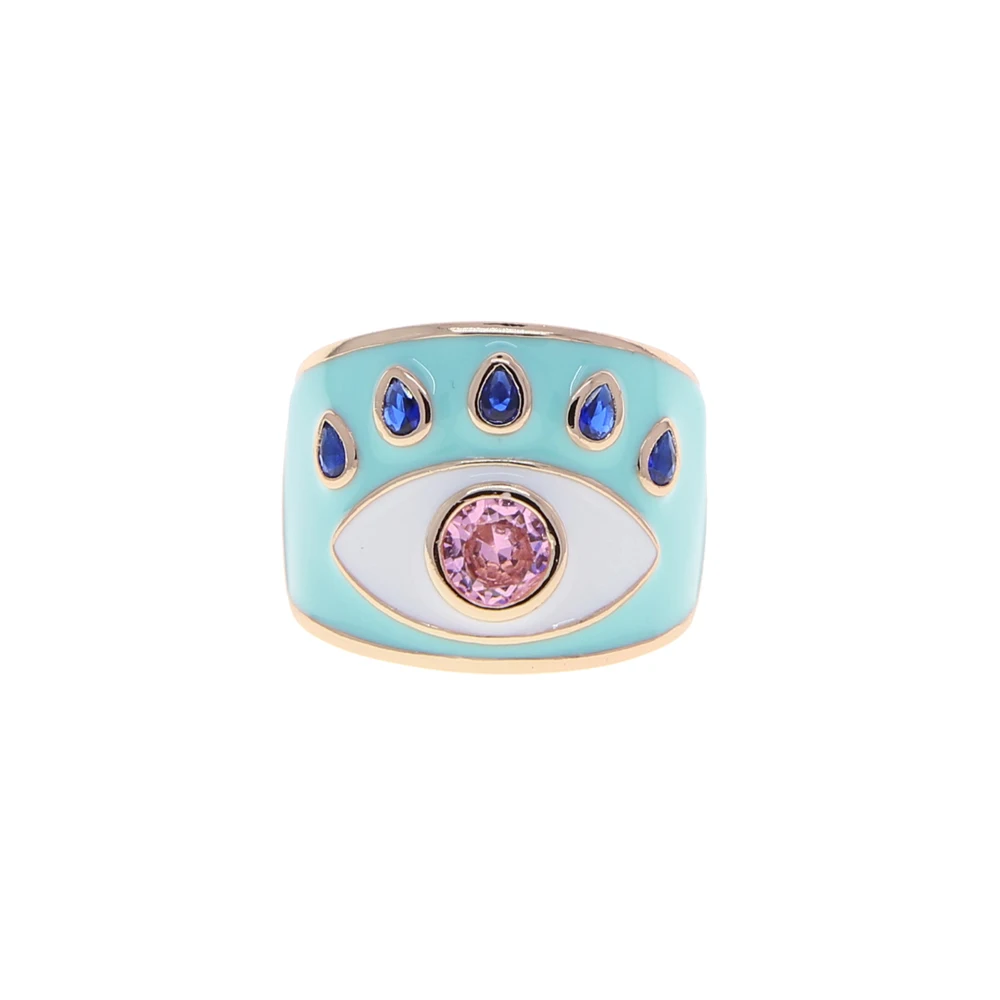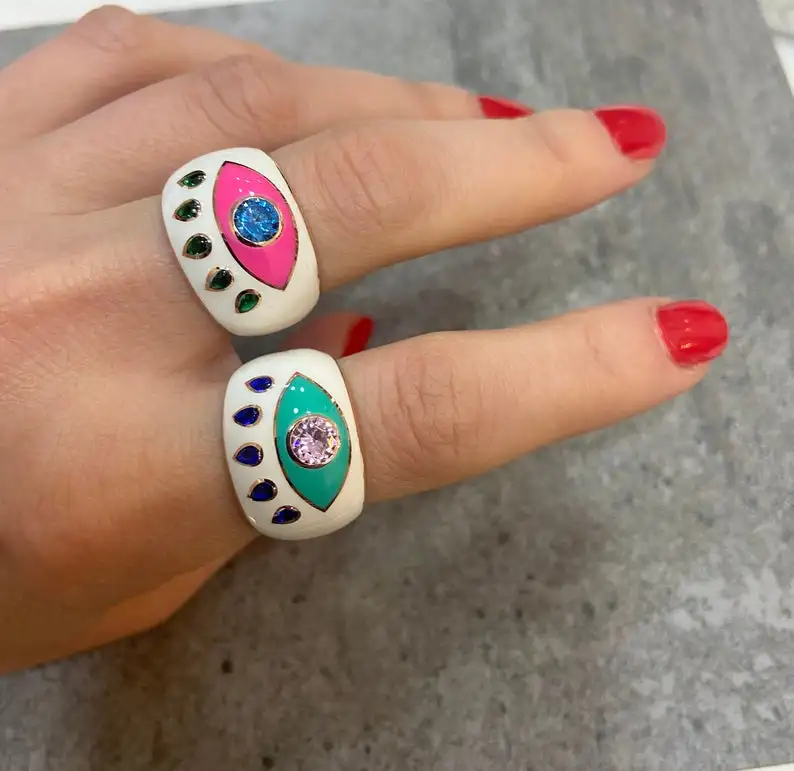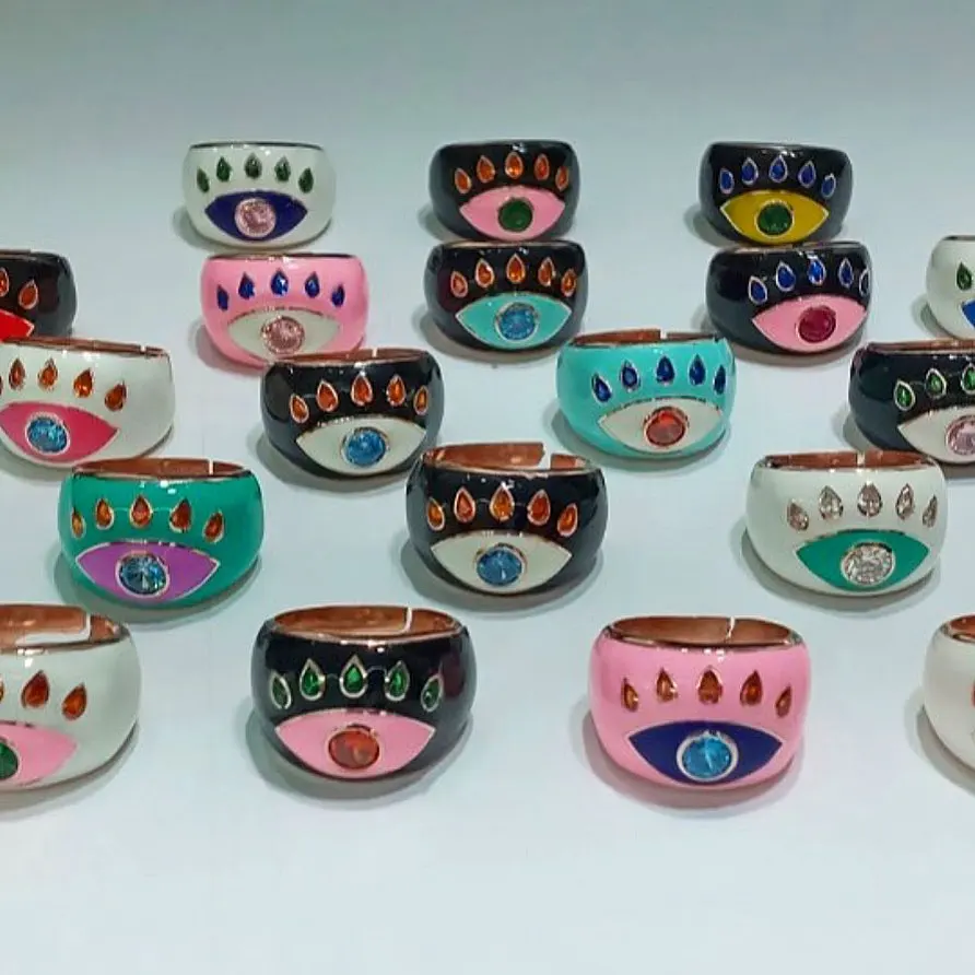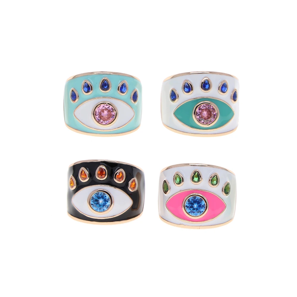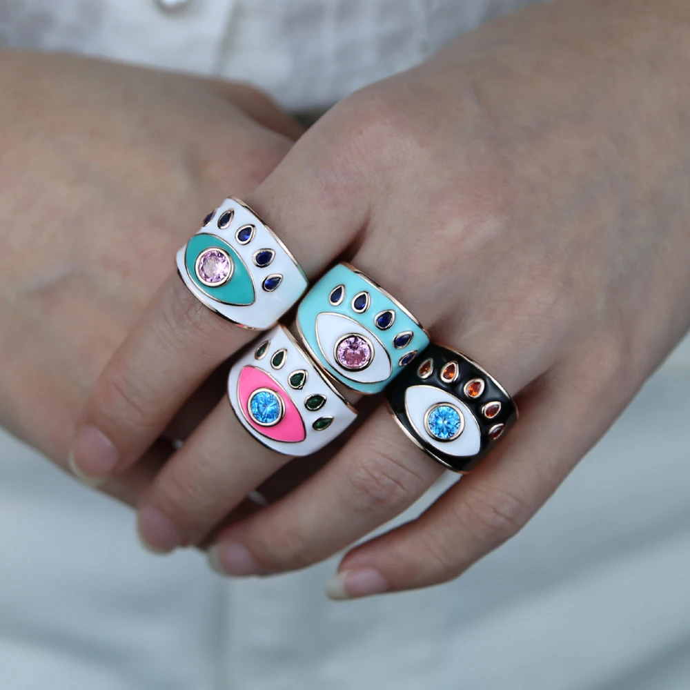 Open #7 Rose Gold Color Pink White Blue Black Colorful Enamel Lucky Turkish Evil Eye Big Women Finger Ring